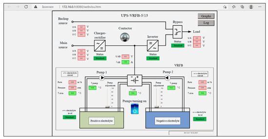 A software for online remote monitoring of the VRFB operation allows the user to remotely receive all the necessary data from the PLC, as well as control all the functions provided (Figure 9).