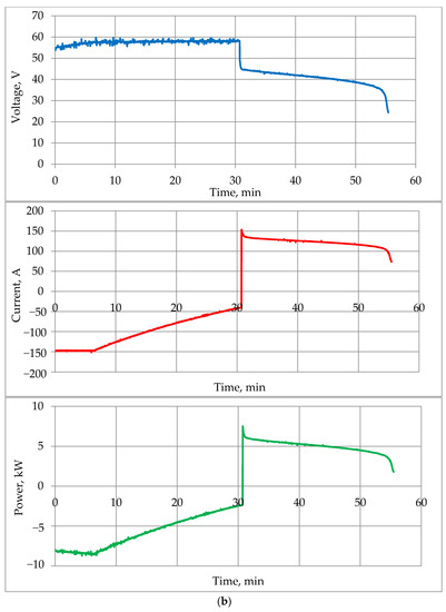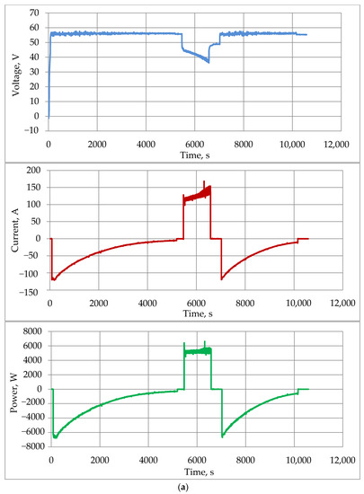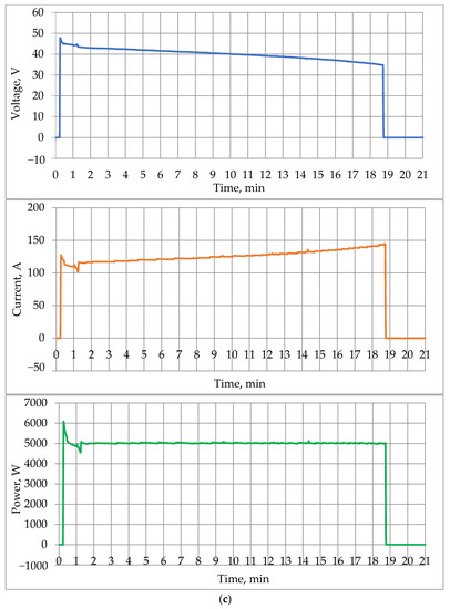Additionally, tests of the VRFB operation were carried out when charging in the same IU mode and then discharging to a load with a constant power consumption (Figure 10c). To implement the latter condition, some of the RB-315 resistive elements were switched on through a load control unit based on a transistor switch. During the discharge, the duty cycle of the control pulses of the key was automatically changed in such a way that the power released at the load was as close as possible to the specified one (5 kW). Since the PACB was charged in a similar way, only a part of the graph corresponding to the discharge mode is shown on Figure 10c.