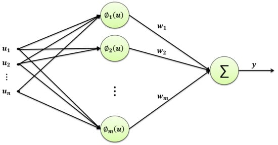 In reference [24], the fuzzy clustering method is used to classify the RBFN input space. In reference [25], the combination of the fuzzy system, genetic algorithm, and RBFN is used to find the optimal values of the PID coefficients. In references [26,27,28], the fuzzy system is used to adjust the middle-layer parameters of the RBFN. However, articles on the fuzzy type-2 combination with the RBFN are few. In reference [29], an RBFN with type-2 fuzzy intermediate-layer neurons with interval weights is presented. A type-2 fuzzy set is used in RBF neurons and at regular weights. A typical RBFN network is given in Figure 1.