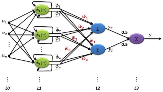 In the weights between the hidden layer and the output layer, neurons employ type-1 fuzzy membership functions (MFs), as seen in Figure 2. Adding a delay unit to the network as an input allows us to better describe and identify dynamical systems, since their output is time dependent. To be sure, depending on the system’s complexity, delays may be taken into consideration, but if an appropriate response is not obtained, the number of delays should be raised. For the RBF layer, we have: