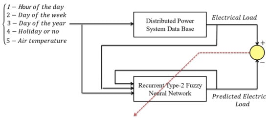 The general diagram is given in Figure 3. In the load forecasting method, the type-2 fuzzy (T2F) RBFN is employed to construct the relationship between input variables () and forecasting load (y). In the electricity distribution network, distributed renewable energy sources, active loads, and electricity markets are highly uncertain. Therefore, the modeling tool (here the recurrent type-2 fuzzy RBFN) must be able to provide an accurate model. Input and output data are recorded at the power distribution company’s center and backed up. The number of inputs of the T2F-RNN can be increased or decreased. For example, in some articles, only two inputs (load in the past and day of the year) are considered, and in others, in addition to these two, the amount of temperature, humidity, holiday and non-holiday electricity costs, etc., are also considered. However, it should be noted that the number of inputs should be commensurate with that particular area (city). So, a mapping function of inputs to output is created as follows: