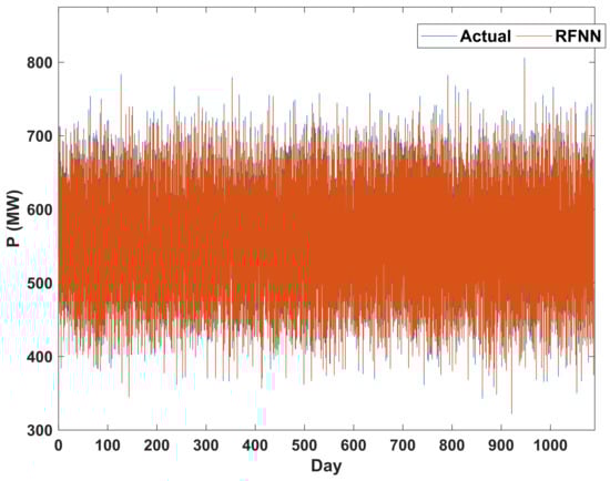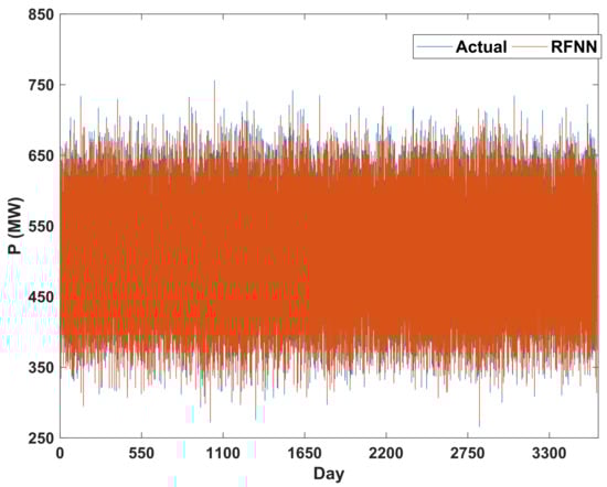 This section deals with the LF problem using the RFNN. Inputs in the recurrent fuzzy neural network model are hours, days of the week, holiday (0) and non-holiday (1), days of the year, air temperature, as well as the output in the past moment. The output is the amount of electrical load. However, the recurrent fuzzy neural network has five inputs and one output. A case study is the Kermanshah City, which is a large city in western Iran. The reason for choosing this city is its complete information and data. Here are the results of the recurrent fuzzy neural network training for some hours on some days. In Figure 4, the 10-year interval data from 2008 to 2018 are applied to the proposed recurrent neural network and the results are shown.