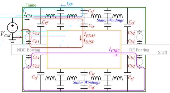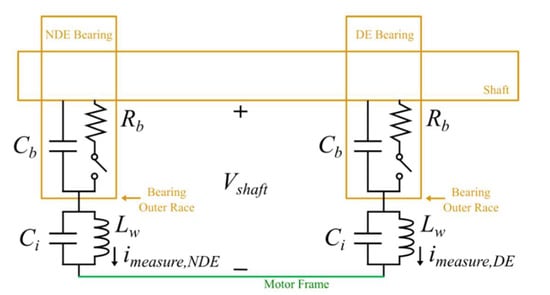 The bearing displacement current iDISP (see Figure 1) is due to the time rate of change of the shaft voltage, which acts across the inner and outer race of both the drive end (DE) and non-drive end (NDE) bearings. This mode of bearing current is small in amplitude, and researchers agree that bearing displacement current has negligible effects on bearing operation and lifetime [,].