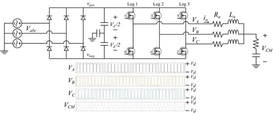 The power electronic inverter of a PWM motor drive generates high frequency voltage pulses that produce time varying phase currents that drive the machine. In an ideal three phase motor driven by balanced voltages, the phase voltages and currents sum to zero. However, in many PWM drives such as the two-level six-switch inverter, the phase voltages do not sum to zero. Consequently, a nonzero voltage potential is present at the motor neutral point, known as the common-mode (CM) voltage as given in Equation (1).