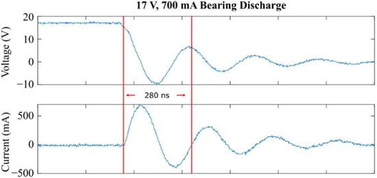 Although an EDM event occurs at just one bearing, the bearing capacitance of the opposite bearing is included in the parasitics that cause the ringing discharge phenomenon, therefore a discharge at one bearing can be seen in the measurement wire inductance of the other bearing [], although with a much smaller amplitude. It is important to distinguish these EDM bearing currents from circulating bearing currents, even though like circulating bearing currents an EDM discharge can be seen at the opposite bearing from where it occurred. For circulating bearing currents, the current magnitude is equal and opposite at each bearing, as each bearing dielectric film has been punctured, where only one bearing dielectric film is punctured for EDM bearing currents. In this paper, the breakdown voltage and the peak of the bearing current are used to characterize each discharge that occurs. For example, the EDM discharge of Figure 5 is characterized as a 17 V, 700 mA discharge.