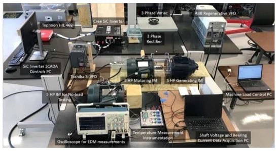 Experimental testbed constructed for the acquisition of shaft voltages and EDM bearing currents for Si- and SiC-based PWM inverters.