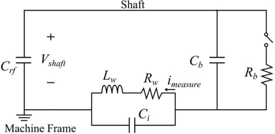It should be noted that although a measurement is now available, it is impossible to directly measure the actual bearing current [], and the measurement modification alters the discharge phenomenon. As can be seen in Figure 4, the insulating sleeves introduce an isolation capacitance Ci, while the jumper wire for bearing current measurement introduces a parasitic inductance Lw, parasitics which are not negligible at EDM bearing current discharge frequencies. However, even though the modification has altered the true measurement, the apparent bearing current measurement is still proportional to the actual value []. For this reason, this paper will refer to experimentally measured bearing current as “apparent bearing current”. The equivalent circuit model for the EDM bearing current phenomenon is shown in Figure 4. The discharge resistance is denoted Rb. The actual bearing current for the modified machine can be computed by obtaining precise values for the components of Figure 4 (Ci, Lw, Cb, Rb). Discharge modeling considerations will be discussed in Section 4. The bearing discharge is modeled with a simple RC circuit and switch [], and the parasitic components from the motor modification are included.