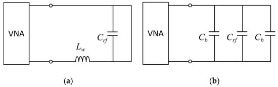 The equivalent circuit model for analyzing EDM discharge transients at the DE bearing is shown in Figure 7. Network analyzer S11 parameters were used to extract the component values for Crf, Ci, and Lw under rated speed and zero speed conditions using a NanoVNA vector network analyzer. At rated speed and low bearing operational temperatures, the bearing lubricant remains intact allowing for a network analyzer measurement of the parallel combination of Crf and the two bearing capacitances at the DE and NDE. The rated speed test was performed on an unmodified IM, which ensured that the measurement circuitry did not alter the measurement. At zero speed, the bearing lubricant film is thin enough to conduct due to direct contact of the bearing ball and race surfaces, resulting in a short across Cb, which in turn allows for a network analyzer measurement of Lw. For Ci, this parameter was extracted by removing the motor end and measuring the S11 parameters between the bearing outer race and the machine frame. An additional parallel plate capacitor calculation using a polyoxymethylene dielectric was performed for Ci. The bearing capacitance Cb was also characterized on a separate testbed using S11 parameters. Additionally, a function generator with 50 Ω source resistance was utilized to apply a voltage step to the machine shaft. Since the equivalent circuit of the voltage step is a first order RC circuit at rated speed (lubricant remains intact), the charging rate can be used to extract the net capacitance on the shaft, which then can be used to produce a Crf measurement. It was determined that the grounding wire resistance Rw is negligible compared to the discharge resistance Rb, and that the isolation capacitance has negligible effects on the discharge transient. Finally, as was available, the measured circuit component values were compared with values published in the literature as a final check. In Figure 8, the equivalent circuit models for zero speed and rated speed conditions are provided.
