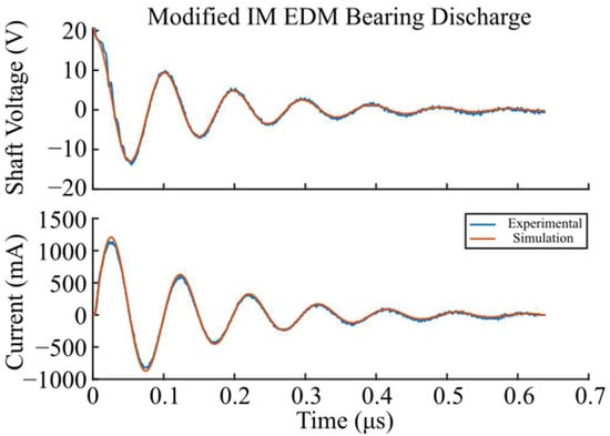 The EDM discharge model of Figure 7 was implemented in PSpice. Parameter tuning was performed using the PSpice Optimizer tool. This tool tunes the parameters of the simulation model to match experimental shaft voltage and bearing current measurements. Experimentally measured and literature values were used as seeds for the refined parameters, and the model refinement was approached by refining parameters in different order combinations, to ensure the quality of the results. Table 1 summarizes the modified IM circuit modeling component values, and Figure 9 shows experimental and simulation results for a 20 V, 1150 mA discharge.