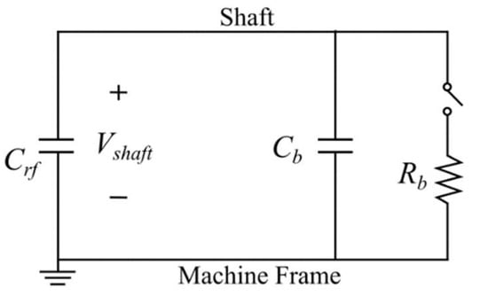 To minimize switching losses and reduce torque ripple, fast on/off times for an inverter’s semiconductor switches and high device switching frequencies are desirable. The introduction of these high frequency components in the CM voltage of the windings causes a CM current to flow through otherwise irrelevant parasitic capacitive paths in the machine. These parasitic paths lead to electrostatic energy build up on the machine shaft. The resulting shaft voltage is a function of the BVR given in Equation (2) for an intact bearing lubricant where, as seen in Figure 1, Csr is the stator winding-to-rotor capacitance, Crf is the rotor-to-frame capacitance, and Cb is the bearing capacitance [,]: