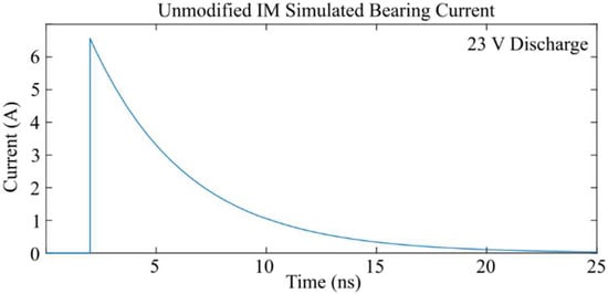 The PSpice model developed from the previous section can be used to extract the EDM bearing current profile and amplitude for an unmodified IM where a bearing current measurement is not available. In Figure 10, a 23 V shaft voltage discharge that occurs on an unmodified IM is shown.