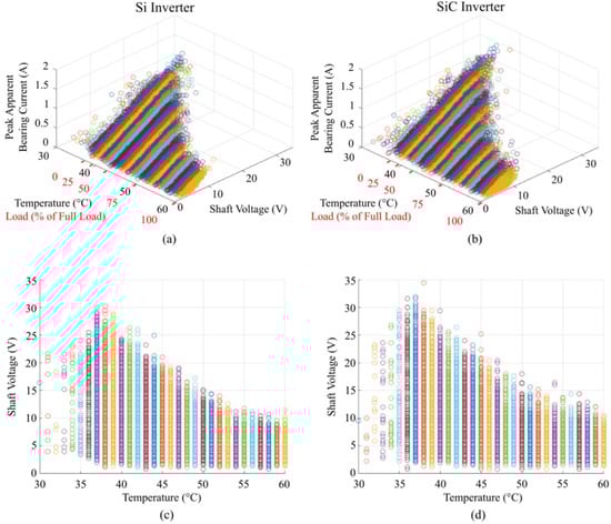 The results presented showed that the worst shaft voltages and bearing currents occurred at lightly loaded conditions where the bearing lubricant film is thick, and as the film becomes thinner at higher temperatures, the magnitude of the shaft voltages and EDM bearing currents decreased. Overall, SiC devices cause higher shaft voltages and EDM bearing currents when compared to Si devices, and this phenomenon becomes significant at machine loads greater than 75% of rated load. Therefore, a significant difference in bearing lifetime may be observed between Si- and SiC-driven machines, given that a machine is typically operated above 75% of rated load to maximize its economic investment.