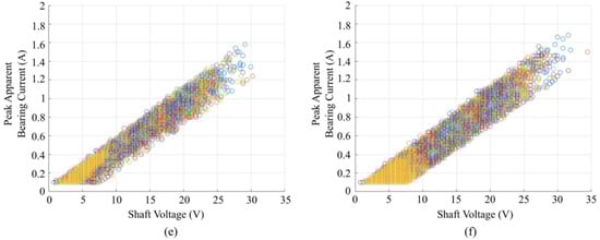 The peak apparent bearing current amplitude is linearly dependent on the shaft breakdown voltage at each motor operational point due to the linearity of the discharge circuit (Section 3, Figure 13e,d). A line of best fit was calculated using a least squares fit for the data displayed in Figure 13e,d.