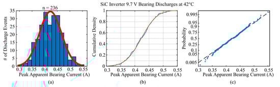 The resulting peak apparent bearing current follows a normal distribution for any particular shaft breakdown voltage, in this case for the SiC inverter 9.7 V discharges at 42 °C: (a) histogram of experimental data with fitted theoretical normal distribution, (b) cumulative density plot comparing data (blue) with theoretical normal distributions (orange), and (c) probability plot demonstrating the normally distributed data.