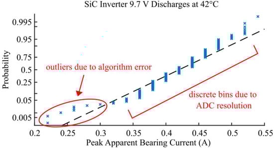 While this least squares line fits the data shown, inspection of Figure 13e,d reveals that the apparent bearing current for any amplitude of shaft voltage has a distribution about the value given by Equation (4), as shown in Figure 14. This is due to the variable discharge resistance. To investigate this, three different discharge sets were analyzed for the Si and SiC inverter shaft voltage and bearing current data: 9.7 V discharges produced by the SiC inverter at 42 °C, 7 V discharges produced by the SiC inverter at 37 °C, and 15 V discharges created by the Si inverter at 38 °C. It was determined that the peak apparent bearing current for any particular shaft voltage follows a normal distribution, the results of which can be seen graphically in Figure 14 for the SiC inverter 9.7 V discharges at 42 °C.