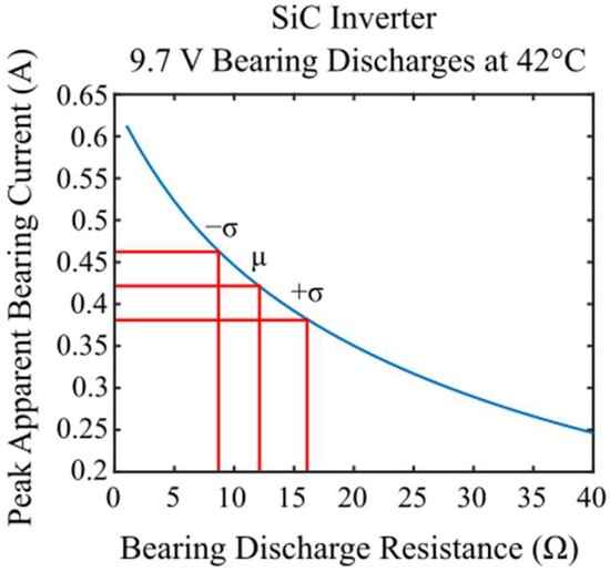 To investigate the discharge resistance distributions, the modified IM equivalent circuit discharge model of Section 3 was employed to explore the bearing discharge resistances that are associated with the peak apparent bearing current amplitudes measured that form the distributions of Table 2. A parameter sweep was performed in PSpice on the bearing discharge resistance, resulting in varying peak apparent bearing current amplitudes. The results can be seen in Figure 16 for the 9.7 V SiC discharges at 42 °C.
