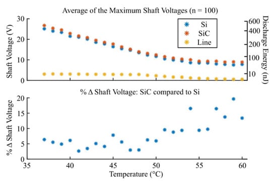 This section analyzes the parameters that affect the amplitudes of the EDM discharges. To compare the change in maximum discharge amplitude at each operational temperature, an average of the 100 largest discharges at each temperature point are compared between Si and SiC inverters, and the shaft voltage for a line-driven machine is also recorded to provide a reference. The increase in shaft discharge voltage between SiC and Si inverters was calculated as:
