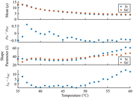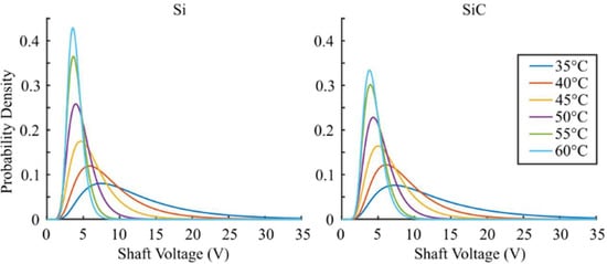 Difference plots are also provided in Figure 20 to see the difference between the Si and SiC distribution parameters. A slight difference in the distribution mean can be seen at temperatures greater than 45 °C (greater than 50% of machine full load) and a significant difference in the distribution shape parameter develops above 50 °C. For temperatures below 45 °C, the trend of the differences between the distribution parameters are not as strong, although the plots of Figure 17 still suggest that shaft voltages due to SiC inverters have slightly larger magnitudes in this region. As the temperature increases, the decreasing mean shows how the distribution of shaft breakdown voltages are shifted to lower values, while the increasing shape parameter helps account for the discharge voltages being concentrated into a narrower value of voltages, becoming less right skewed with an increase in temperature. When comparing the devices, the relatively larger mean and lower shape parameters of the SiC inverter shows that the distributions cluster more narrowly at a lower shaft breakdown voltage for the Si inverter. The smaller shape parameter exhibited by the SiC inverter at temperatures greater than 50 °C demonstrates that these distributions are more skewed to higher energy values than the Si inverter distributions at the same temperature, which means that the amplitude of shaft breakdown voltages is larger in this region for the SiC inverter. Therefore, although EDM discharges due to shaft voltages and bearing currents are most intense at lightly loaded conditions, the greatest difference between EDM discharges for Si and SiC devices is seen at bearing temperatures greater than 50 °C (>75% of rated machine load). These results indicate that substantial differences in bearing lifetime may be seen when driving a machine at rated load with SiC devices, compared to Si devices.