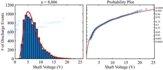 Histogram with inverse Gaussian distribution and probability plot for SiC inverter shaft breakdown voltage data at a bearing temperature of 45 °C. In 1000 ms at fs = 10 kHz, 8006 discharge events were recorded.