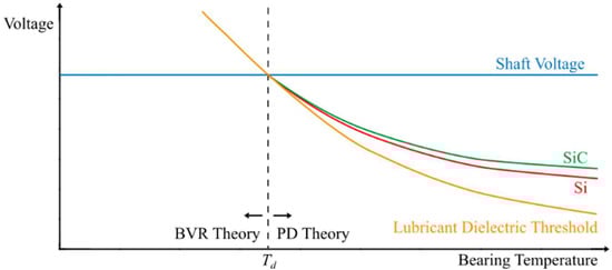 As previously mentioned, various researchers have demonstrated that the voltage slew rate of a voltage pulse applied across a dielectric significantly affects the breakdown voltage magnitude [,,,,]. Wang et al. [] developed a mathematical model to predict an expectation breakdown voltage given an inception voltage, a maximum possible breakdown voltage, an exponentially probabilistic function that describes the electron delay time of the system, and a slew rate of the applied voltage pulse. Applied to the bearing discharge phenomena, the expectation voltage is the predicted breakdown voltage, the inception voltage is the bearing lubricant dielectric breakdown voltage at dc, and the maximum possible voltage is set by the system’s voltage source, which would be the shaft voltage due to the BVR. The model effectively demonstrates how voltage pulses with higher slew rates produce larger expectation voltages at breakdown, given that all other parameters are fixed. Unfortunately, this mathematical method contains too many degrees of freedom to apply to the physics considered in this paper. Nevertheless, the concept remains a valid framework for analyzing electrical discharge behavior in motor bearings for alterations in the semiconductor device slew rate and contains the underlying principle that connects the BVR theory with the pulsed dielectric theory. As previously discussed, the BVR is a function of the machine parasitic capacitances. The changes of these parasitics that set the BVR are negligible across operational temperature, therefore the voltage that attempts to build on the shaft as produced by the CM voltage remains constant in amplitude throughout bearing temperature. However, the threshold for lubricant dielectric breakdown decreases with an increase in temperature, as has been experimentally and statistically demonstrated in this chapter. The temperature Td at which the threshold for bearing lubricant dielectric breakdown becomes equal to the maximum shaft voltage is where the first bearing discharges appear, as seen in Figure 21.