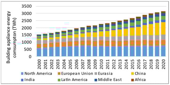 Energy consumption of building appliances by region. Data extracted from IEA [3].