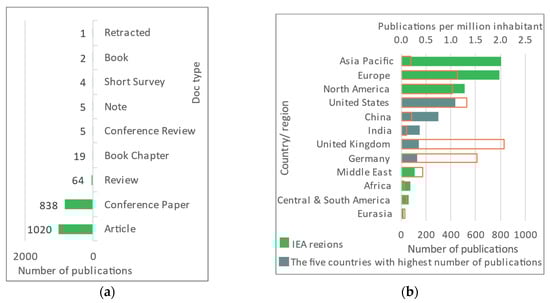 Figure 4a shows that around 50% of publications on the topic are articles/papers and the other 50% are conference papers, with a small number of reviews and books. The same distribution is also followed individually by all countries included in the study. Moreover, when analyzing the number of publications by region, Figure 4b shows that the Asia Pacific and Europe show similar values, being the regions with the highest number of publications. Followed by North America with 35% fewer publications. When analyzed by country, the United States is the country with the highest number of publications, followed by China.