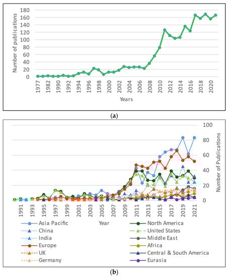 Trends in the number of publications in the area of study (a) worldwide (b) per country.