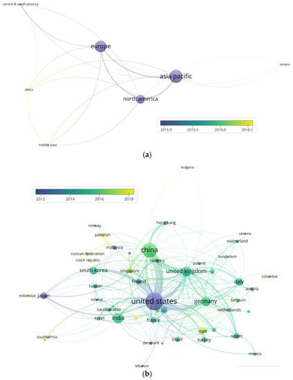 Figure 6 shows the relationship between the countries’ publications obtained with VOSviewer. When considering countries aggregated in the IEA regions Figure 6a, the network highlights that Europe, Asia Pacific, and North America are the regions with the oldest research publications, showing more recent interest in the remaining regions. This is evidence that this topic has spread from developed to developing regions.