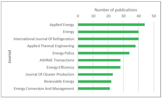 The analysis of the authors with a higher number of publications (Table 3) shows that R. Saidur from Sunway University of Malaysia is the author with the most documents (12 publications). The most-cited article by R. Saidur (published in 2002) is an experimental analysis of two domestic refrigerators to investigate the effect of variables such as temperature, thermostat setting positions, and door opening on energy consumption. His research reveals that room temperature has the greatest effect on energy consumption, followed by door opening [12]. Furthermore, the most recent publication by R. Saidur (2021) reports on a thermodynamic analysis of a domestic refrigerator using the nano-refrigerant Al2O3. The results showed that the energy consumption of the refrigerator was reduced by approximately 2.69% when using 0.1% Al2O3 [13].