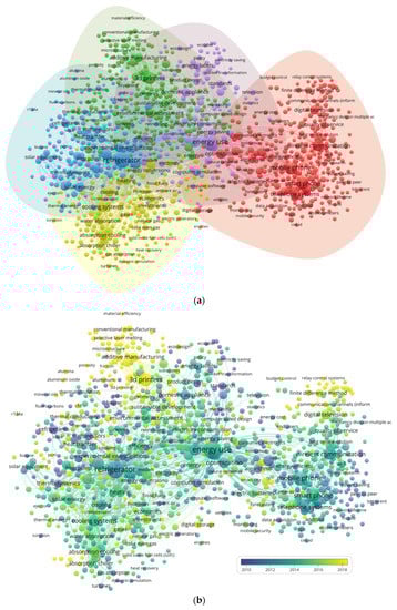 Efficiency in appliances co-occurrence keyword network, (a) grouped in clusters, where each color groups keywords in a cluster, (b) overlay visualization, where color indicate year of publication.