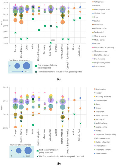Average publications year and number of occurrences of the different appliances in each studied country/region. Data from the Scopus query. The green crosses indicate the first appliance efficiency standard or policy implemented in each country/region. The dark green crosses indicate the first appliance efficiency standard or policy that includes brown goods appliances. Data obtained from the IEA policies database [46], (a) range of years from 1985 to 2020, (b) year range from 2005 to 2020.