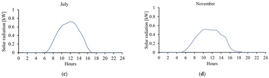 Figure 1a–d shows the yield attained from Renewables.ninja considering 4 months (February, April, July, and November) following different days with an hourly distribution trend for one year, namely 2019. The considered months showed different solar radiations reached in a year. In particular, the flexibility of a 1 kW hourly peak as an output power of a PV system has been recorded. It is worth noting that every line relates to data from a sample day of each considered month from a particular yearly dataset.