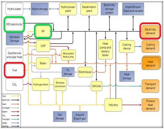 Energy, economics, and environmental assessments can be performed through EnergyPLAN® [39], which is designed to exploit the synergies enabled by including the whole energy system as expressed in the smart energy system concept. EnergyPLAN® simulates the operation of energy systems, including the electricity, heating, cooling, industry, and transport sectors with a sampling time of 1 h. It provides results on a yearly basis with the possibility of obtaining monthly aggregate information regarding power stations and/or RESs’ production, as well CO2 emissions emitted into the atmosphere due to the use of conventional power stations or FFVs. In EnergyPLAN®, the whole system is modelled as a single entity: it is a holistic approach where the supply and demands of different energy systems are balanced for a whole year. The EnergyPLAN® model has been generally applied on a state or a country level [39], and for insights and policymaking at different levels as well. Connolly et al. [40] described that the main objective of this tool is to support the design of long-term energy planning strategies by modelling the complete energy system. It makes it possible to identify problems and make strategies for the whole energy system rather than for specific sectors [41].