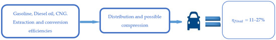 This sub-Section describes the current scenario of Pakistan and the impact of fossil fuels feeding into FFVs in terms of overall efficiency. Typical fossil fuels used in Pakistan for road transportation are petrol, diesel, and compressed natural gas (CNG). Most of the fuels are imported, thus resulting in an efficiency chain drop moving from extraction, conversion, compression, and finally distribution. The efficiency of fossil fuels referred to natural gas, coal, and oil-based power plants are 34–56% [49,50], 32–42% [50,51], and 32–40%, [52,53], respectively. For electrical power production, both line and transmission losses account for about 10–20% [54]. Figure 3 shows the FFVs’ efficiency chain. The fossil fuel chain starts from the extraction of the crude oil and finishes with its transformation to be then used. Later, the chain shows the distribution of the efficiencies during the transport towards the oil station, thus providing the final overall efficiency [55] of FFVs when they are effectively used.