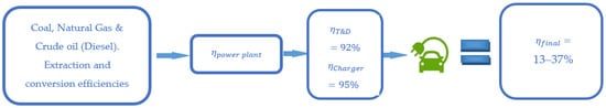 Regarding Scenario 1, charging strategies and their efficiencies consider that the EVs are charged through the national electric grid, thus powered by conventional power plants fossil fuel-based in the nighttime and through PV in the daytime. The electricity generation using fossil fuels is a foundation of modern society. Cheaper technologies and fossil fuels have built an energy sector constructed across these fuels. The power plants have been designed in such a place where fossil fuels were easily available, distributed, supplied, and easily handled. Figure 4 shows the overall performance chain of EVs charged in the nighttime with the power plants fed by fossil fuels. The chain begins from the extraction and the conversion of the crude oil in a refinery plant and then ends up with its distribution towards the required facilities such as power plants or oil stations [56,57]. The electricity generated in the power plant is distributed through the electrical grid to reach the charging stations, which are then used to supply electricity to EVs [58]. Finally, the overall performance of the process is presented considering the values of each subprocess previously mentioned.