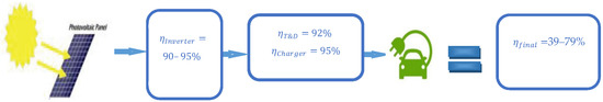 Figure 5 shows an EV’s efficiency chain powered by a RES such as PV, then there is the inverter [59], charger, and electrical grid transportation efficiencies to reach the charger station that affects the performance of the overall process. The aim of analyzing these scenarios is to forecast how the current situation, namely using only conventional power plants fossil fuel-based, can be changed by initially using these plants to feed EVs, and then increasing the penetration of PV to further contribute to the EVs’ feeding and lower the CO2 emissions as well.
