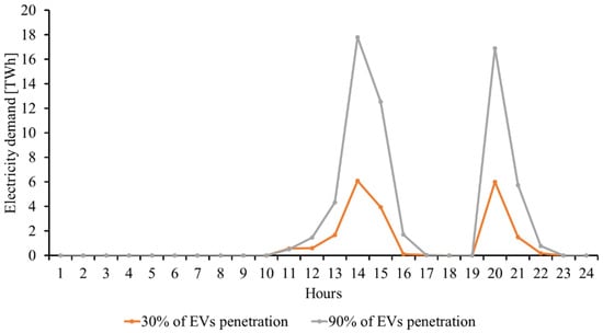 Figure 8 shows the forecasted electricity demand for 30% (2030) and 90% (2040) EVs penetration in a day. As it can be noticed, the electricity demand is higher during office hours. In Pakistan, office hours usually range from 9:00 a.m. to 5:00 p.m., and the peak electricity demand can be observed between 2:00–3:00 p.m. or after lunch. In the nighttime, the maximum electricity demand is recorded at 8 p.m., and it reduces afterward since EVs are assumed to be no longer recharged. From the obtained results, it is clear that the highest daily EVs’ electricity demand will occur during the daytime using PV, while the remaining electricity demand will be covered during the nighttime by the conventional power plants fossil fuel-based via the national electric grid.