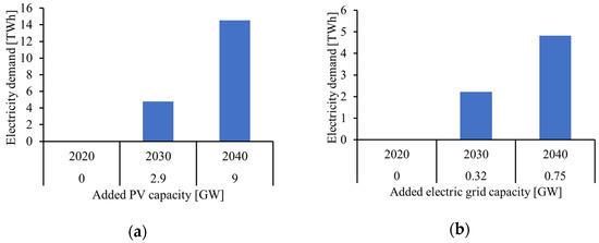 Yearly EVs’ electricity demand with (a) added PV (daytime) and (b) added conventional power plant (nighttime) capacities.