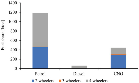 Figure 10 shows the fuel share of Pakistan in the year 2020 for 2/3 wheelers and cars. It can be noticed that 3-wheelers hold a maximum share of CNG, and they are used as a means of public transport widely. Then, 2-wheelers are commonly fed by CNG and petrol to cover short distances. So far, diesel cars did not have a huge share compared to the others fueled by petrol and CNG in Asian countries [65]. As most of the fuels are imported into Pakistan, the use of more efficient energy vehicles is an important part to minimize the trend of the imported fuels, thus the introduction of EVs would be beneficial for the country from both the economic and the environmental points of view.