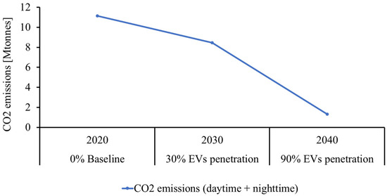 In this regard, Figure 11 shows the trend of what could be obtained by considering the EVs charge through PV (daytime) and the national electric grid (nighttime) according to the results obtained in this study.
