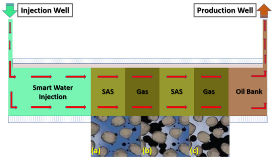 Schematic diagram of SWAF process, which displays the injected scheme scenarios of SWAF method, which starts with smart-water (SW) injection as a secondary mode to change the reservoir wettability (conditioning the reservoir), then the injection of SAG (SAS Alternating Gas) i.e., SAS followed by gas injection (i.e., CO and N) slugs injections as a tertiary mode or stage. (a) Injection of SWAF solution in presence of crude oil, (b) SWAF solution interacts with crude oil, and (c) oil detaches from rock and moves toward production well.