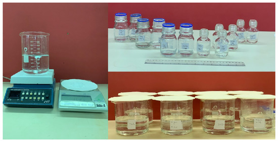 The designed smart water solutions used in this experimental work were prepared based on standard solution preparation procedures. The ionically modified brine stock solutions were synthesized by mixing the six main salts with deionized water at ambient temperature (25 °C) and atmospheric pressure (1 bar), as shown in Figure 3; a stock solution is a concentrated solution that has to be diluted to some lower concentrated for actual use. The designed smart water solutions are divided into two parts, (i) we varied the concentration of a solution by diluting the salinity of seawater to obtain the optimum salinity, and (ii) we varied the ions in single and binary ionic compound low salinity water at a fixed optimum salinity to examine the effect of single ions and the relative effect of ion in the presence of the other ion. The salinity is fixed at (3500 ppm), which is found to be the model concentration from the first part for the designed smart water solutions. Moreover, the seawater composition used in this experimental work is synthesized based on the typical seawater composition, which has a salinity of 35,000 ppm [45]. It is then further diluted to 5, 10, 20, and 50 times indicated as (Seawater/5), (Seawater/10), (Seawater/20), and (Seawater/50), respectively. To sum up, all brine formulations are tabulated in Table 3. The ionically modified brine stock solutions were further diluted to desired concentrations using the following simple equation;