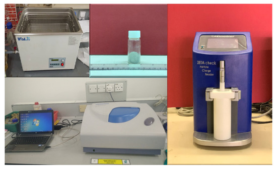 Zeta potential (ZP) measurements; Zeta-sizer (SZ-100) (bottom left), the ultrasonic bath (top left), and Zeta-check (Particle Matrix GmbH) (right).