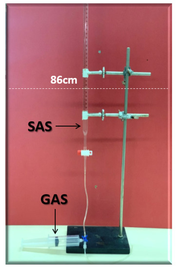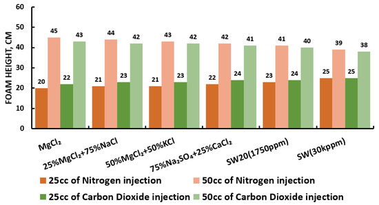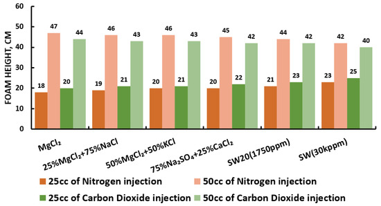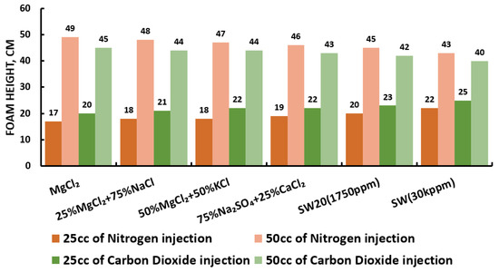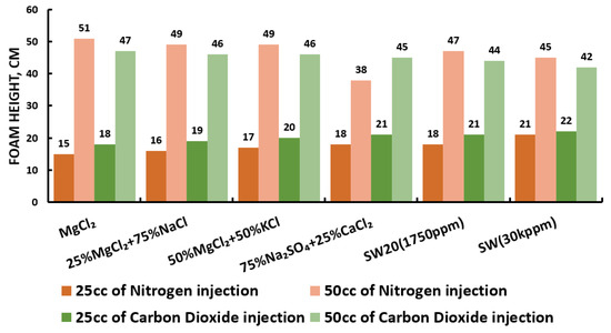 Figure 8 displays the foamability and foam stability setup used to generate the required foam. For the foamability and foam stability experiments, FW (i.e., mL at the height of 86 cm) were poured into glass columns. Then, with the aid of a syringe, fifty (50 mL) and twenty-five (25 mL) of gas (N or CO) were manually introduced into FW within the first 20 s (i.e., average volumetric rate of and L per hour). Following the gas injection, the valve (stop-cock) connecting the column with the syringe was immediately closed. Hereafter, the initial foam and FW heights were measured. Foam heights and FW level were then measured again at five (5) minutes intervals to determine the R5 parameter. Moreover, the foamability and foam stability tests were conducted for each selected surfactant at different concentrations in the absence and presence of crude oils (Type A and Type B). Finally, the most effective FW (in combination with the most effective gas type) were determined and their foamability and foam stability were further studied at different smart water (SW) solutions with different salinity levels and in the presence of crude oils (Type A and Type B) [20].