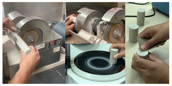 Indiana limestone (ILS) core sample preparation procedures using geological cutter machine, polisher, and sandpaper preparation.