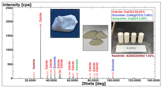 X-ray fluorescence (XRF) and X-ray diffraction (XRD) were applied to identify the component minerals of the Indiana limestone (ILS), and thus provide a better understanding of the reactions and interactions of our specific COBR system (i.e., the interactions between brine–crude oil and brine–rock interfaces). X-ray fluorescence (XRF) analyses the components (i.e., ion type) present in the rock core sample, whereas X-ray diffraction (XRD) determines the rock core samples’ possible mineralogy. This can double confirm the actual mineral content that existed in the rock sample and provide a more complete and accurate mineral characterization of the Indiana limestone (ILS) core sample. Finally, the acquired data from XRD was processed for identification of different minerals sorted according to their respective diffraction angle or identification-2 (X-access) and intensity or quantification (Y-access) on a diffraction pattern curve as shown in Figure 11.