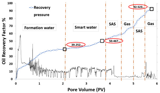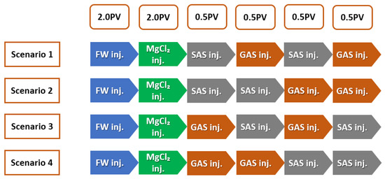 Thus, as mentioned above, this research paper presents an innovative hybrid EOR technique that coalesces smart water (SW) injection and foam-flooding termed smart water-assisted foam (SWAF) flooding for application in carbonate reservoirs. We have designed the SW solutions to have the characteristic of dual-improvement effects of wettability alteration of carbonate rock and of stabilizing the foam film during the foam flooding stage. This characteristic of the dual improvement effect is resulting in compounded oil displacement. Both the rock–fluid and fluid–fluid interactions are affected by the designed SW solutions. The first effect is improvement in the rock–fluid interaction through surface charge alteration at the rock–fluid interface, causing the change of reservoir rock wettability towards a further water-wet state. The second enhancement effect of the smart water is the modification of fluid–fluid interaction via abating the shielding effect of the electrical double layer (EDL), which improves foam film stability [29,30,31]. These changes in surface charges at both rock–fluid and fluid–fluid interfaces cause the rock–water interface and the water–oil interface to become of the same sign (i.e., negative or positive charge), creating stable water and foam film, augmenting better EOR (i.e., improved recovery factor or ) [29,30,31,32]. Moreover, a synergy effect is generated when the smart water solution is combined with foam flooding via alternating (SAS) and gas (i.e., SAG) injection. By adding surfactant into the smart water (SW) solutions (to generate foam) micro-emulsions form between oil–brine interface producing a synergy effect, resulting in further wettability alteration and interfacial tension (IFT) reduction and helping improve the displacement efficiency i.e., oil recovery. Figure 1 illustrates the injection scheme of the SWAF process, which is comprised of two stages. The first stage is smart water (SW) injection for changing the wettability to become more water-wet by improving the water film stability while simultaneously enhancing the foam lamellae stability as the foam is generated during the second stage. Next, the SAG (surfactant aqueous solution alternating gas), is employed to decrease the interfacial tension and improve the displacement efficiency. Furthermore, it should be noted that to date, to the best of our knowledge, there have not been any detailed theoretical nor experimental investigations (i.e., in existing literature) about the coalesced dual improvement effect of wettability alteration and foam stability using smart water in the course of foam flooding in carbonate reservoirs. Thus, to the best of our knowledge, there have been no reported works in the current literature that critically assess the residual oil recovery through the SWAF process in carbonate reservoirs.