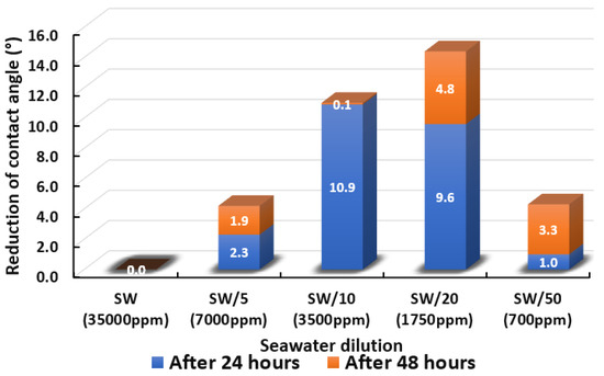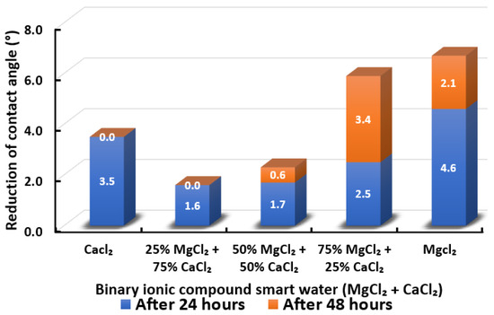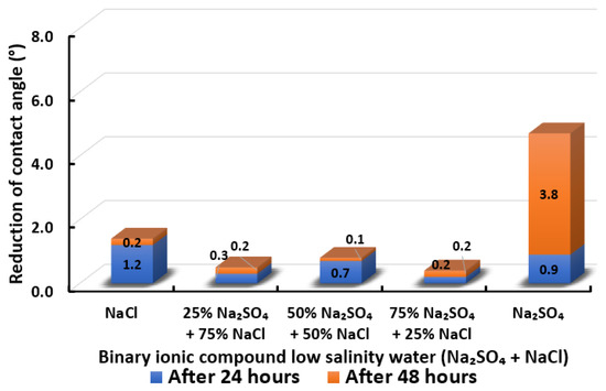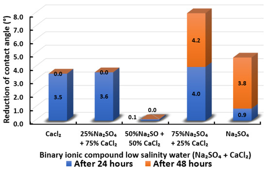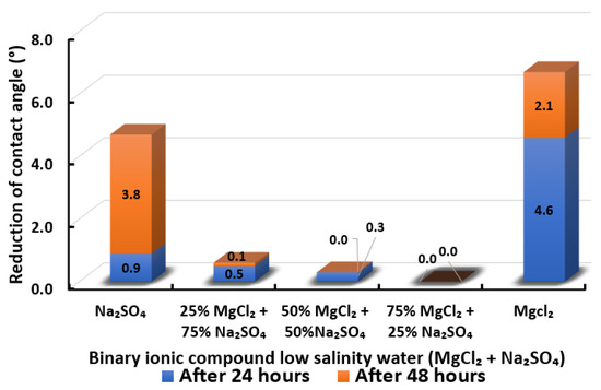 Following the compatibility test between injected fluid (e.g., our designed smart water) and formation water (FW), the selected smart water (SW) solutions from the compatibility test were employed in wettability-measurement using contact angle test (CAT). For this study, the contact angle measurement was performed utilizing the Sessile drop-down technique [51,52,53] (i.e., by using IFT 700 set-up) to investigate the effect of SW on carbonate rocks in terms of wettability alteration (i.e., for selecting the optimum SW solutions). Firstly, the model salinity of the designed SW solutions was screened out from the synthetic seawater dilution, which was succeeded by single and binary ionic compounds SW that had fixed model salinity. The process of the Sessile down method was performed in conformity to existing literature [54,55,56]. Additionally, this procedure was executed (repeated) twice in order to ensure the consistency of the wettability measurement test. One should note that the average of the contact angles was taken as the final contact angle for each particular time interval of 0, 24, and 48 h at 80 °C. Smart water (SW) solutions with the maximum and minimum alterations in contact angles for both diluted and ionically modified low salinity brine groups were then shortlisted to advance for chemical screening tests [20].