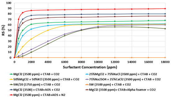 Foam stability is usually encountered in many industrial processes and everyday life phenomena; nevertheless, there exists neither a general theory explaining the mechanism of their stability nor a generally accepted test that facilitates a reliable determination and evaluation of foams formed by different types of surfactants [60]. This is due to the fact that foam is a challenging liquid–gas dispersed system whose properties are characterized by non-equilibrium adsorption coverage at liquid–gas interfaces [61]. In this study, our evaluations to characterize the foamability and foam stability of the surfactant aqueous solutions have been conducted via a rapid and incisive pneumatic test called the R5 parameter. The R5 parameter is described by the ratio of the relative foam height after a five minutes duration to the initial foam height [60,62]. Additionally, the variations in R5 parameter values with changes in surfactant concentrations correspond to those of foam half-life with surfactant concentration. Thus, instead of gauging for prolonged hours for the foam half-life, an equivalent data can be obtained using the R5 parameter test which needs only a few minutes to complete. Furthermore, with the R5 parameter test, specifics about the solution contents of foams can be acquired. Additionally, this parameter can be set as a criterion for the assessment of foam stability [60,62]. The key benefits of the proposed R5 parameter test are given below [60]: