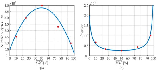 Influence of the average state of charge: (a) number of cycles and (b) fΔSOH,SOC.